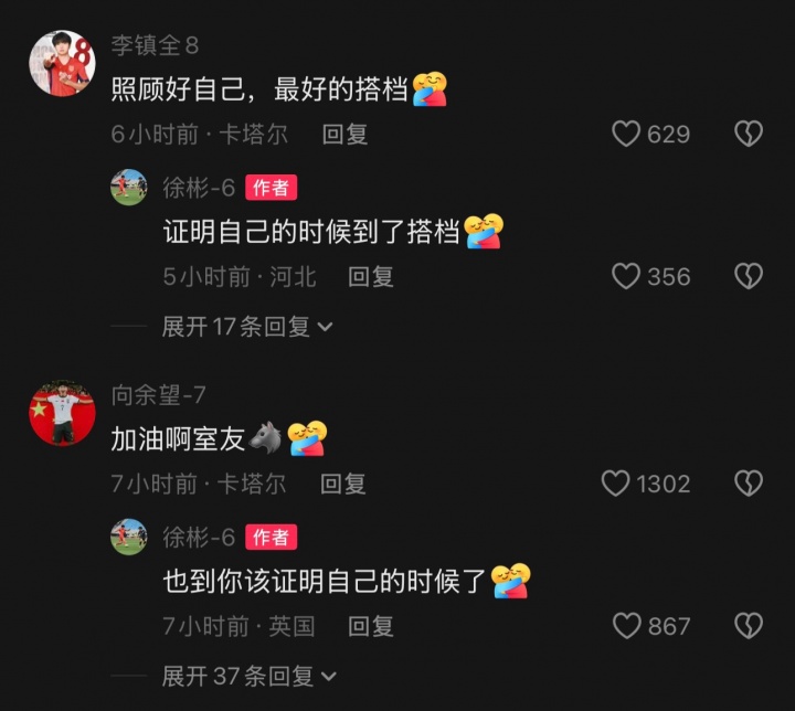 U23国足的队友们纷纷在评论区留言表达鼓励和支持,其中,徐彬回复杨希“等你来找我”,回复彭啸“等你”,回复李镇全“证明自己的时候到了搭档”,回复向余望“也到你该证明自己的时候了”。