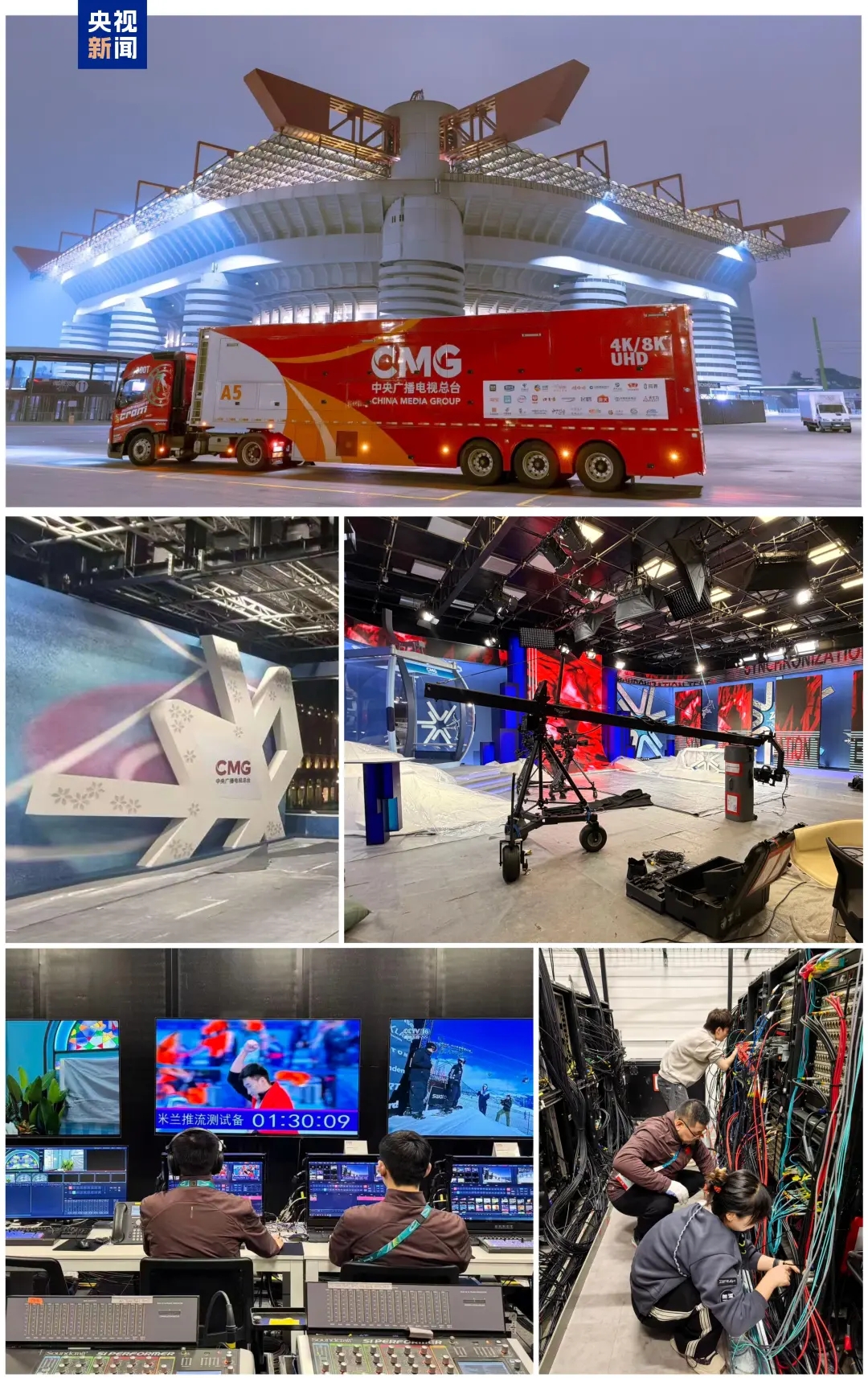 总台“中国红”4K/8K超高清转播车队已于当地时间1月13日抵达意大利米兰圣西罗体育场,完成进驻部署。目前,总台三个IBC前方演播室和米兰外景演播室的舞美制景搭建和技术系统测试已基本完成,利维尼奥的雪山外景演播室建设接近尾声,即将交付联调演练。