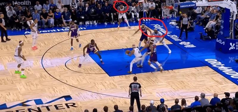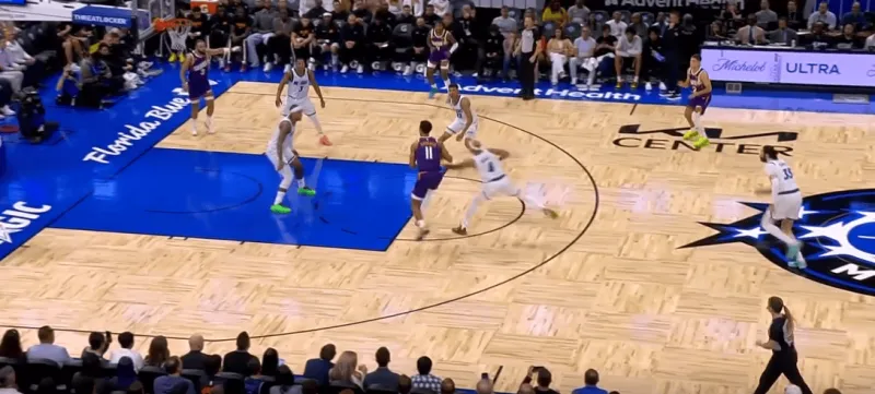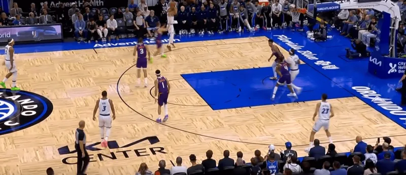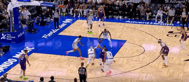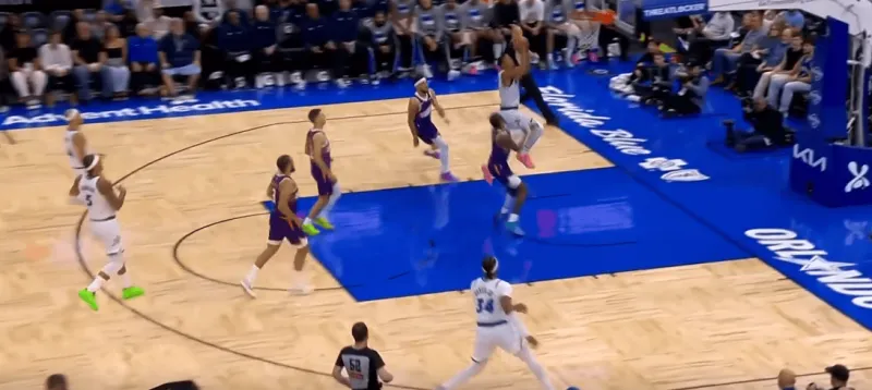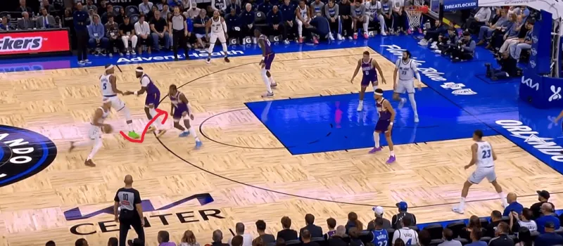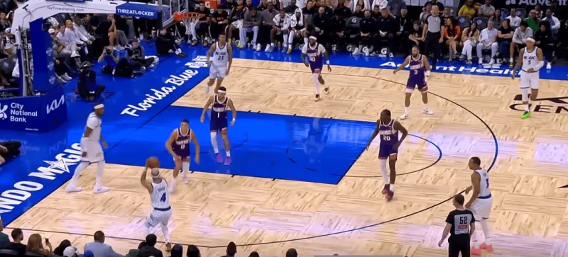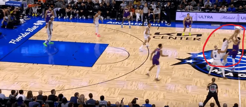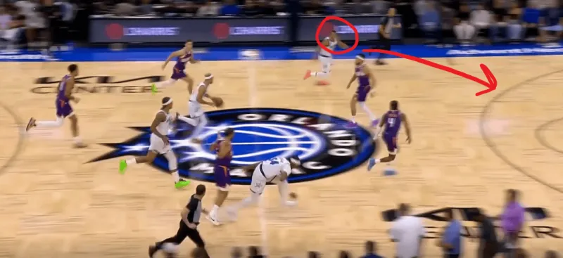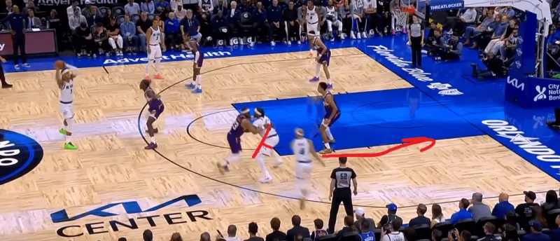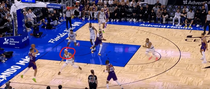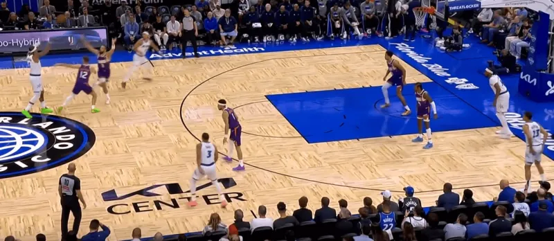 班凯罗这一次在右侧持球,太阳选择了区域防守在右侧布置,萨格斯立刻横切到左侧重新落位,班凯罗迅速甩对角助攻萨格斯命中空位关键三分: