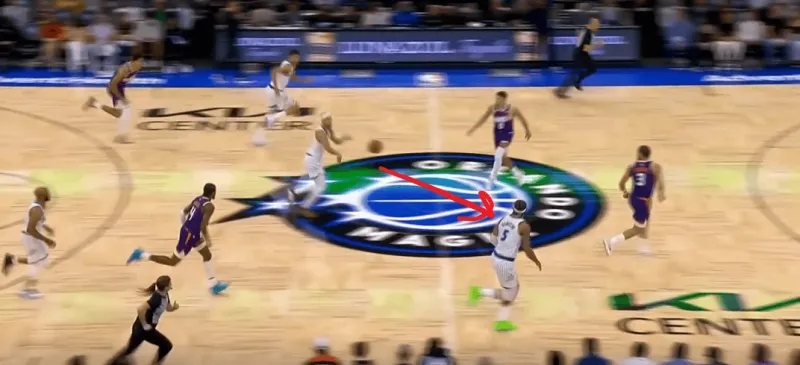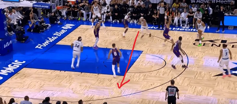 随后在转换进攻三线反击下出球躲过布克的抢断,助攻贝恩快下轻松得分: